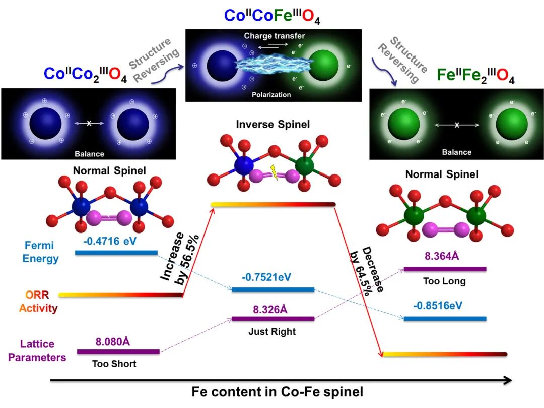 图3. 尖晶石结构八面体位上的异化效应和原子的极化,以及尖晶石结构的晶格间距和费米能级与氧还原的关系图.(Fe:绿色;Co:蓝色;吸附氧:紫红色;晶格氧:红色)[4].