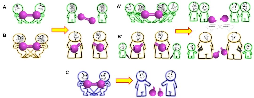 图2是如何高效地掰断塑料哑铃的示意图.图2A显示:小绿人力气太小,不足以掰断哑铃;图2B显示:莽汉力气太大,很容易掰断哑铃,但却死死抓住不肯放手,因而,无法持续不停地掰断哑铃;图2C显示:那个成年人用以掰断哑铃的力气正好,且懂得及时释放,因而,掰断哑铃的效率最高.图2与图1虽然所指不同,却有异曲同工之妙.图2A’通过增加1个小绿人,掰断了哑铃,类似与催化中的双功能催化剂;图2B’通过让小朋友对莽汉挠痒痒分散其注意力而释放哑铃,与文献3报道的“通过削弱CO吸附强度达到增强甲醇氧化效率”的意境不谋而合.