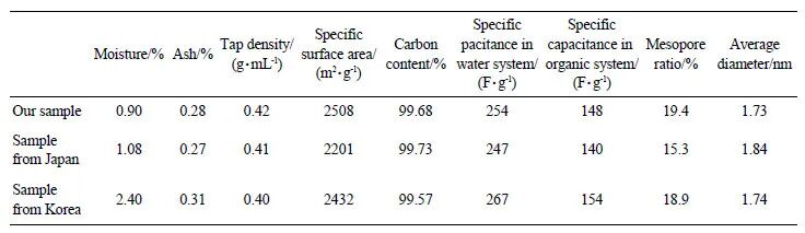 电容炭的各项性能指标都希望越高越好,我们归纳出性能要求“六高”.但是它们是相互冲突的,“此长彼消”,必须根据不同电容器的不同要求,在“六高”中折衷优化,求得最佳效果.在大量实验数据的基础上,我们归纳出电容炭材料性能的最低要求:1)高比表面,> 1000 m2/g;2)高中孔孔容,>0.2 ml/g;3)高电导率,> 2 S/cm;4)高堆积比重,> 0.3 g/ml;5)高纯度,灰份< 0.1%;6)高性价比,最初售价不高于进口同规格产品的70%.