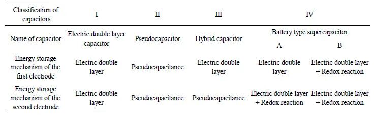 过去,国外专家认为,超级电容器按电极的储能机制划分为双电层电容器、赝电容器和混合电容器三类.随着使用的需求和技术的发展,出现了在电容器电极中添加电池电极材料(即体相的氧化还原机制,不是单纯的赝电容)的新产品,大幅度提高了比能量.这类产品的寿命可以有几万次,又有电池望尘莫及的比功率,电极的组分和比例范围很宽阔,用途更是广泛;而且由于比能量大幅度提高,产品的价格也比电容器大为下降.我们将其列为超级电容器的第四类提交中国超级电容产业联盟理事会,经认真讨论同意(见下表),定义为“电容器的电极中加入电池材料”.