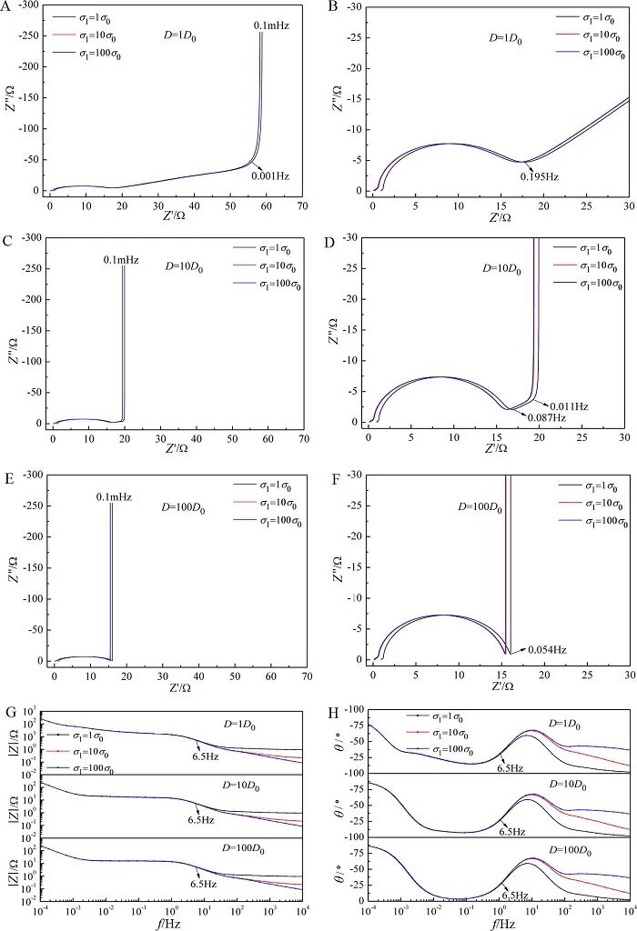 ①D取不同值时σ1变化对电荷转移反应的影响。当D=1D0,10D0,100D0时,fDσ几乎不变,近似保持在1.4Hz,即σ1从1σ0增加到100σ0,主要影响EIS频率区(f > fDσ =1.4Hz),几乎不影响EIS频率区(f < fDσ =1.4Hz),分叉频率 fDσ近似与D无关。