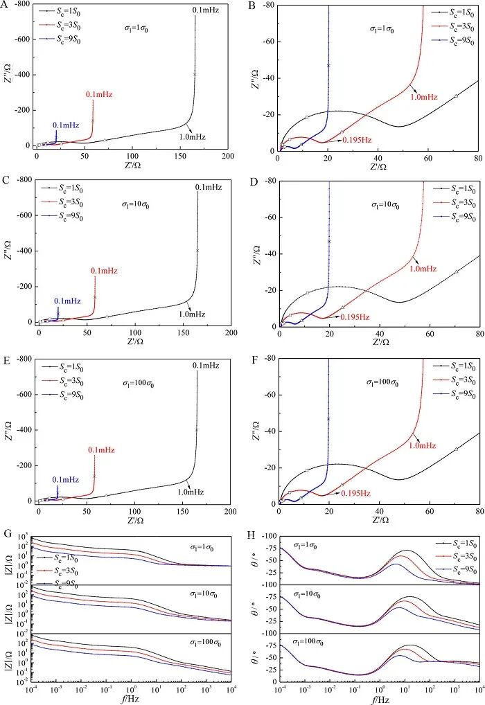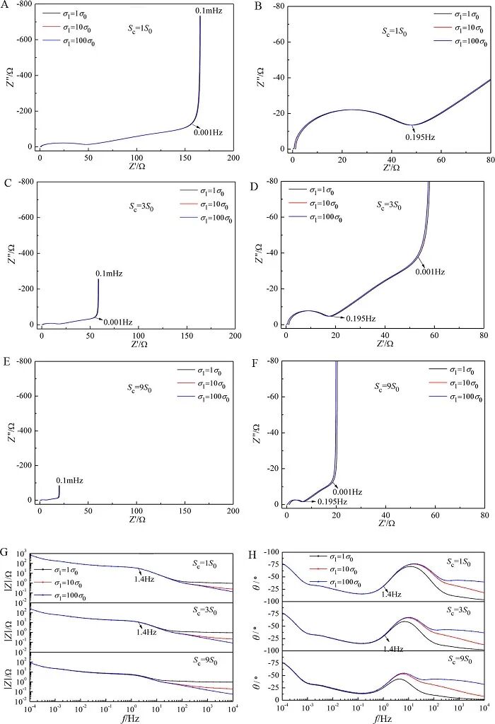 图7 Sc给定,多孔电极阻抗随σ1演变规律。Sc = 1S0时,(A)Z′-Z″图和(B)局部放大图;Sc = 3S0时,(C)Z′-Z″图和(D)局部放大图;Sc = 9S0时,(E)Z′-Z″图和(F)局部放大图;Sc = 1S0,3S0,9S0时,(G)|Z|-f图和(H)θ-f图。