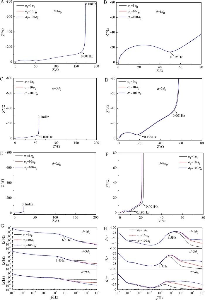 (1) d相对固定而σ1变化。当d=3d0而σ1变化时,多孔电极电荷转移反应所对应的EIS演变规律及其对应EIS特征,参见原文的阐述。