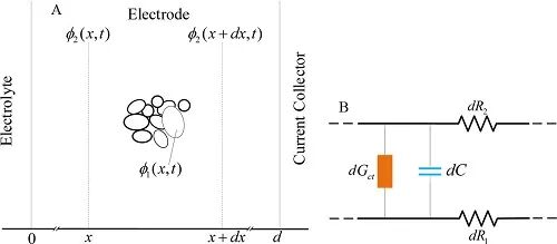 图1 (A)多孔电极结构示意图;(B)多孔电极传输线模型。其中,d为电极厚度,x和t分别为位置和时间变量,ϕ1(x,t)和ϕ2(x,t)分别为电极基体和孔隙电解质的电势。