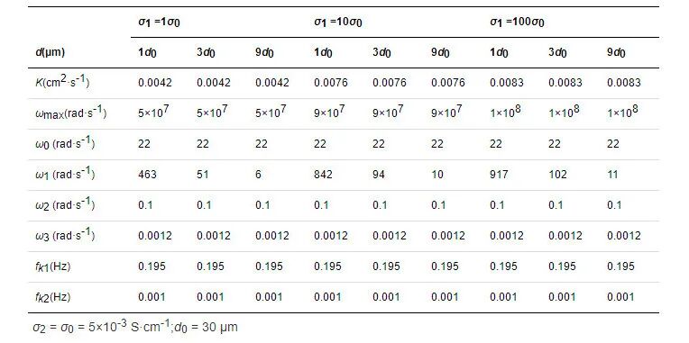 (1) 当时,λ<<d成立,即为厚电极。更进一步,厚电极这一条件可重写为:当运行频率ω<<Λ时,只需ω1<<Λ;当ω>>Λ时,只需ω1<<ω/2。