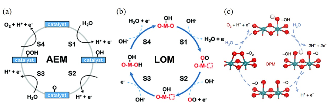 本文首先介绍了目前被广泛研究的OER性能表达与衰退机制。催化剂活性表达机制主要有三种,分别是吸附析出机制(AEM),晶格氧氧化机制(LOM)和多活性中心机制(OPM)。而造成催化剂失稳的原因主要有活性物质的溶解、形貌结构改变与催化剂脱落和催化活性位点被阻塞等几个方面。