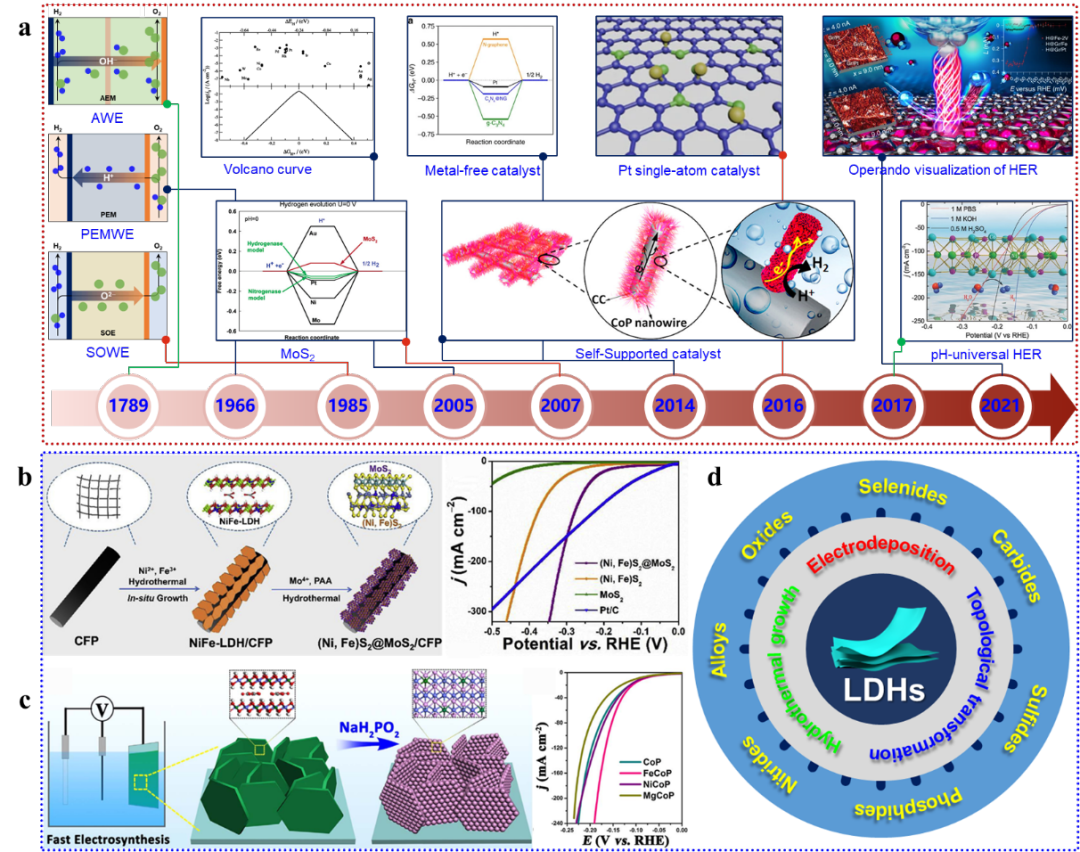自从Troostwijk、Grubb和Donitz在1789年、1960和1980年代分别提出碱性电解水(AWE)、质子交换膜电解水(PEMWE)和固体氧化物电解水(SOWE)以来,开发高效电催化剂成为该领域的研究重点。在过去的几十年里,包括贵金属、非贵金属和非金属在内的电催化剂已经被广泛用于电解水。在各种电催化剂中,层状双金属氢氧化物(LDHs)由于具有优异的析氧催化活性被认为是最有前途的AWE材料之一。此外,LDHs可以通过拓扑转变得到其他高效催化材料(如氧化物、碳化物、硫化物和磷化物),进一步促进了AWE和其他能源转换技术的发展。例如,本课题组以NiFe-LDH为前驱体,通过水热法制备了(Ni, Fe)S2@MoS2异质结构,在AWE中显示出显著的活性和耐久性。在电流密度为10 mA·cm-2时,HER和OER的过电位分别为130和270 mV,超过了大多数报道的电催化剂。此外,本课题组使用金属掺杂的Co-LDHs作为前体,通过原位磷化策略合成了各种金属掺杂的CoP电催化剂,实现了对电解水性能的强化。