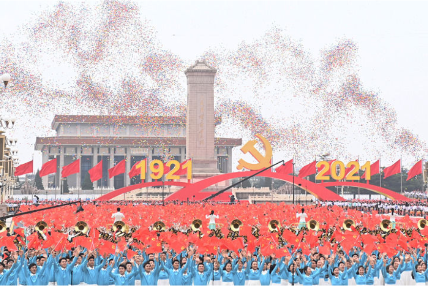 2021年7月1日,举国欢庆,北京天安门广场万众欢腾。庆祝中国共产党成立100周年大会上,站在天安门城楼上,习近平总书记高瞻远瞩:“我们要用历史映照现实、远观未来,从中国共产党的百年奋斗中看清楚过去我们为什么能够成功、弄明白未来我们怎样才能继续成功”。7月1日上午,庆祝中国共产党成立100周年大会在北京天安门广场隆重举行。这是庆祝大会现场放飞气球。新华社记者 李尕 摄