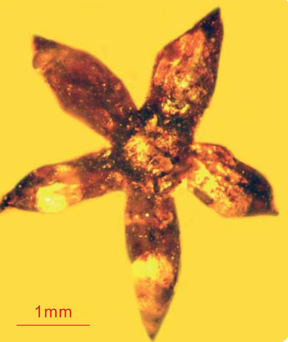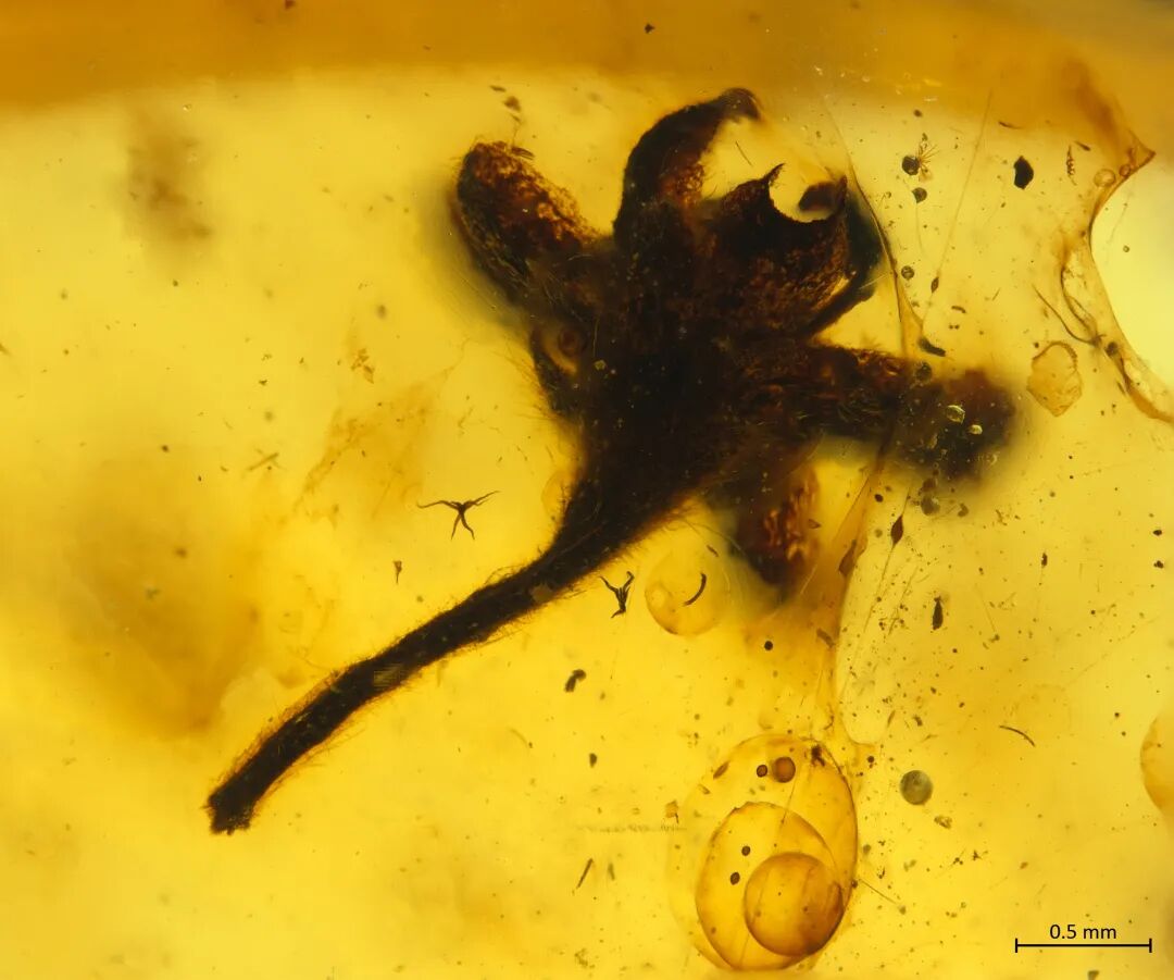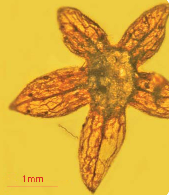 这是一朵盛开时被完整保存在缅甸琥珀中的被子植物雄花,距今一亿年。上图分别为侧面观和腹面观。