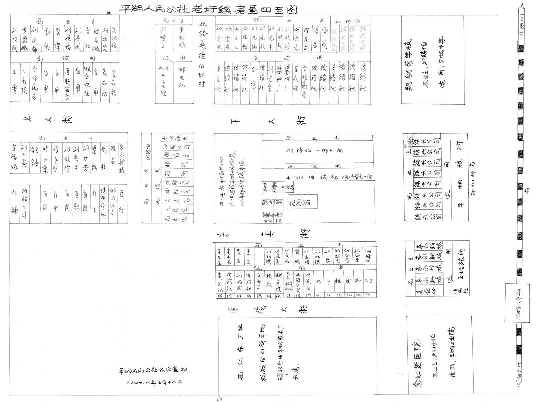1978 年平湖人民公社绘制的“平湖人民公社老圩镇房屋四至图”。平湖墟整体呈“田”字型格局,设有上大街、下大街、守珍街等六条街道。