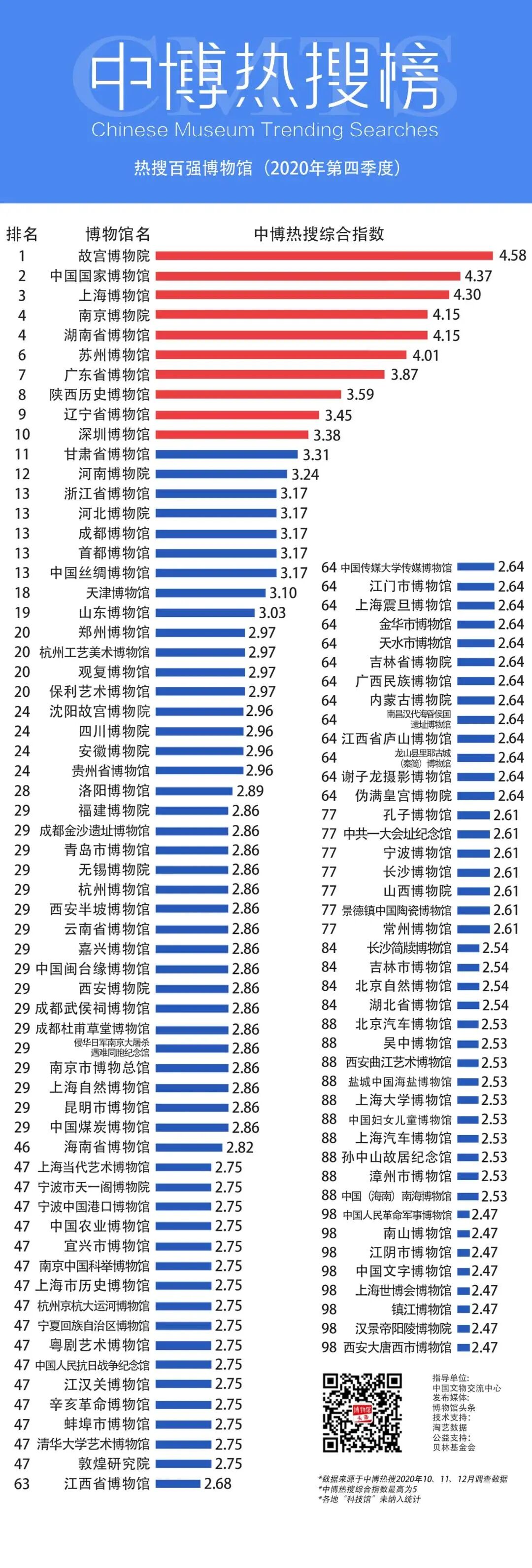 “中博热搜榜”2020年第四季度全国热搜博物馆百强榜单于近日发布,105家受到网友高频搜索的全国博物馆上榜。