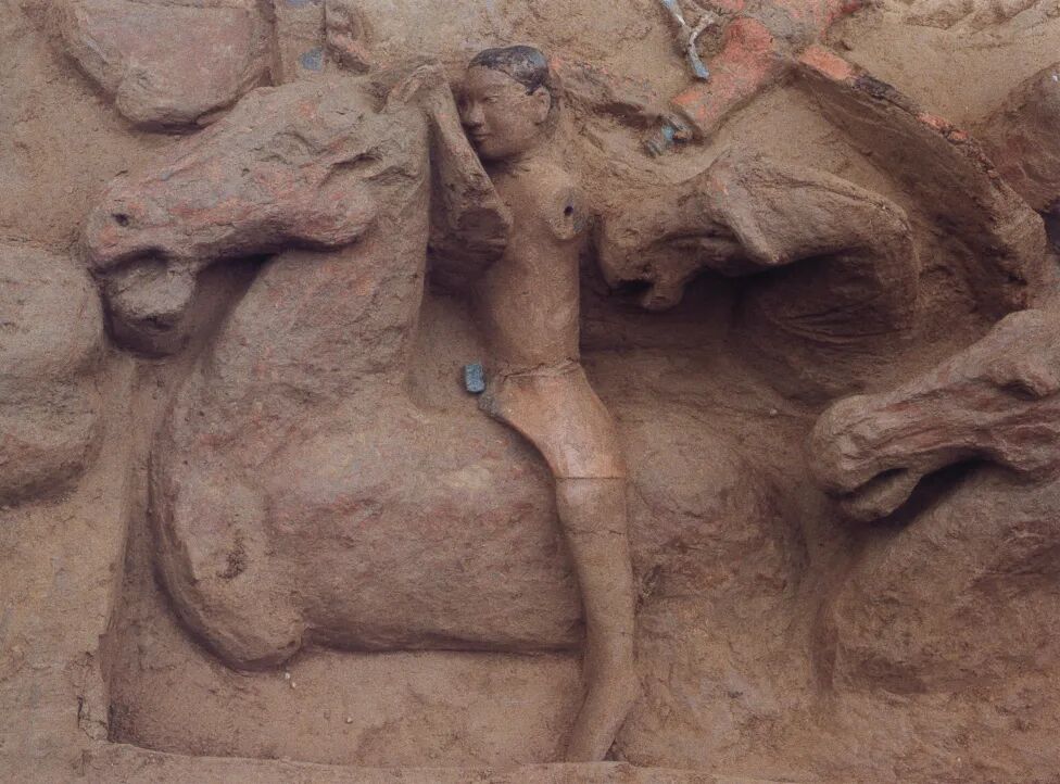 右:汉阳陵彩绘骑兵俑出土情况