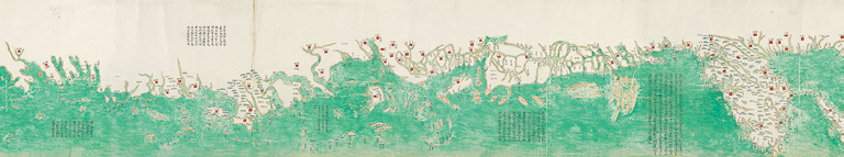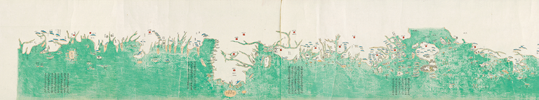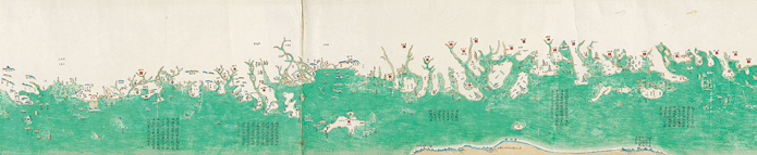 此图由六幅地图组成,与雍正八年(1730)陈伦炯《海国闻见录》所附六幅地图相似。自右至左,依次为:环海全图、七省沿海全图(盛京、直隶、山东、江苏、浙江、福建、广东)、琼州图、澎湖图、台湾图、台湾后山图。所有地图均采用中国传统地形地物形象画法绘制,上为陆地,下为海洋,无固定方位,只反应相对位置。无经纬线和比例尺。图内府治、州治、县治均着红色符号。