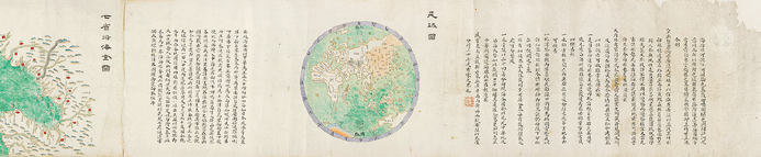 据《海国闻见录》摹绘的地图数量繁多,且在发展演变过程中发生明显分化,形成四海总图、环海全图、天下总图三个子图系。此图属于环海全图图系。图中注文提及“乾隆甲午年丈量得寔”, 且台湾诸罗县已改称“嘉义”,浙江定海县尚未升厅,故此图反映了乾隆五十二年(1787)至道光二十三年(1843)间的行政建置情况。推测此图当摹自此间某幅地图。