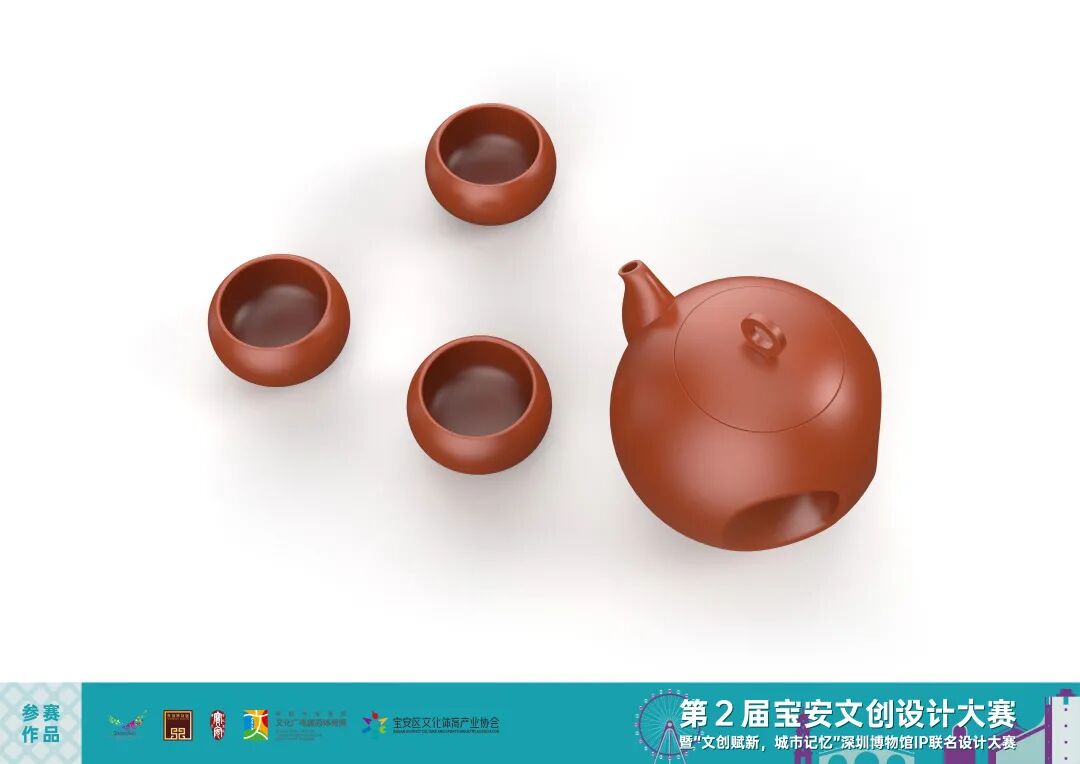 壶身和盖扭为圆形,造型简约、现代、年轻、时尚,壶把和壶身融为一体,凸显整体性和设计感,突破了人们对紫砂壶传统造型的刻板印象。在壶把位置的内部设计了隔热层,防止使用时烫手。茶杯为鼓型,体现了为深圳的包容和开放而打鼓奏乐助兴。