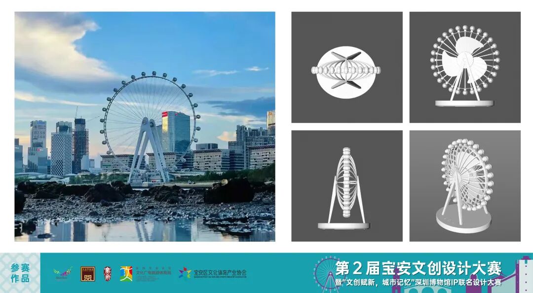 深圳是以现代科技著称的城市,摩天轮也是深圳的新地标,能代表深圳的形象。此作品方便落地生产,可作为深圳的特色礼物、手信。