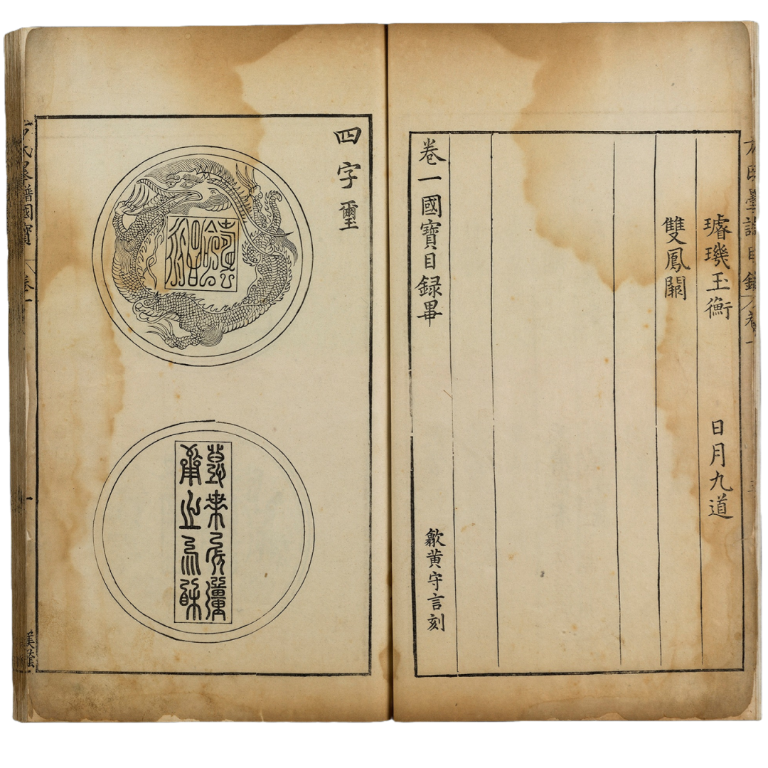 此书为中国印学史上最著名“三堂印谱”之一,初集成书于清朝乾隆十年。此书为墨刻序跋线框释文原章钤印本,汇集明清三百余位篆刻家作品,共四千方。