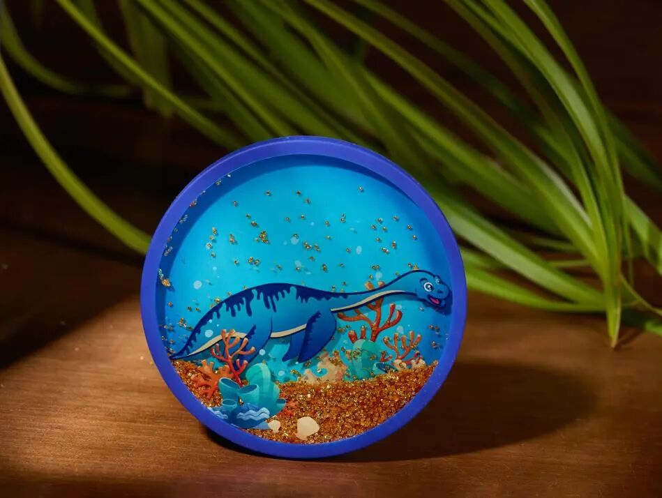 本次设计开发了三款流沙杯垫。其中,“小摩根”遨游款和透明款杯垫在晃动时,滑片可随流沙一起流动,营造出蛇颈龙在海底乘风破浪的逼真效果;蛇颈龙的骨架款杯垫,把考古挖掘的工具如锤子、铲子等做成小滑片,土壤颜色的流沙做成背景,考古知识科普和互动相结合,可以激发大家对蛇颈龙的探索兴趣。