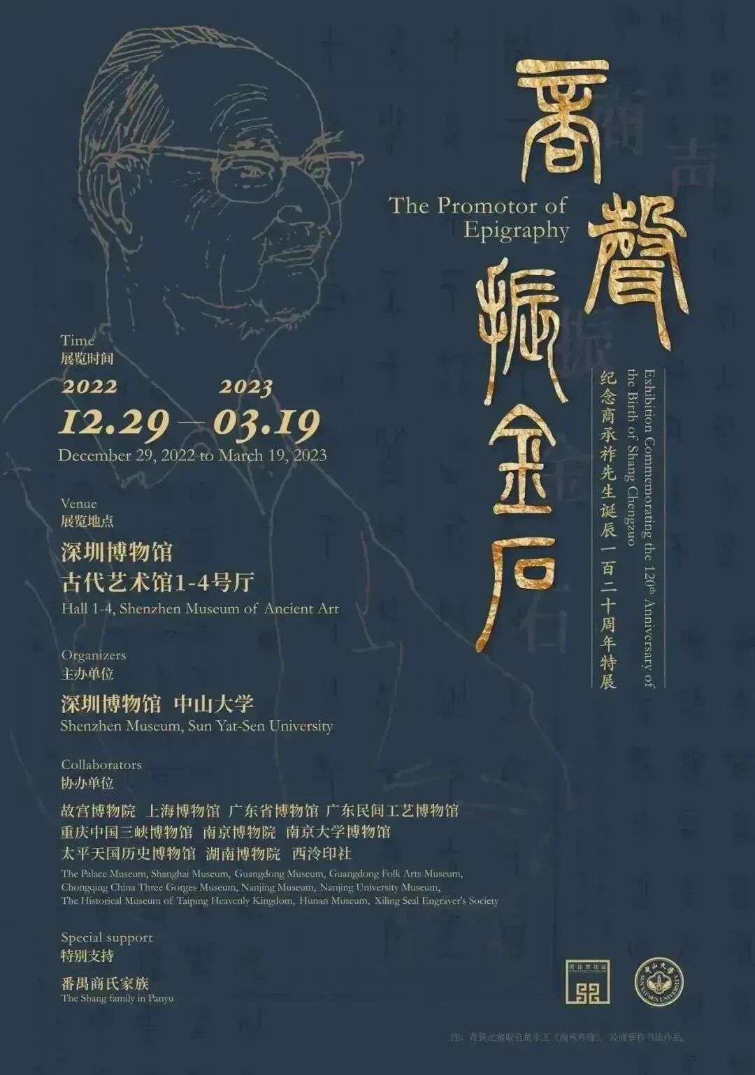 由深圳博物馆和中山大学主办,故宫博物院、上海博物馆、湖南博物院、广东省博物馆、广东民间工艺博物馆、重庆中国三峡博物馆、南京博物院、南京大学博物馆、太平天国历史博物馆、西泠印社等文博单位和高校共同参与的“商声振金石——纪念商承祚先生诞辰一百二十周年特展”在深圳博物馆古代艺术馆开幕。展期持续至2023年3月19日。