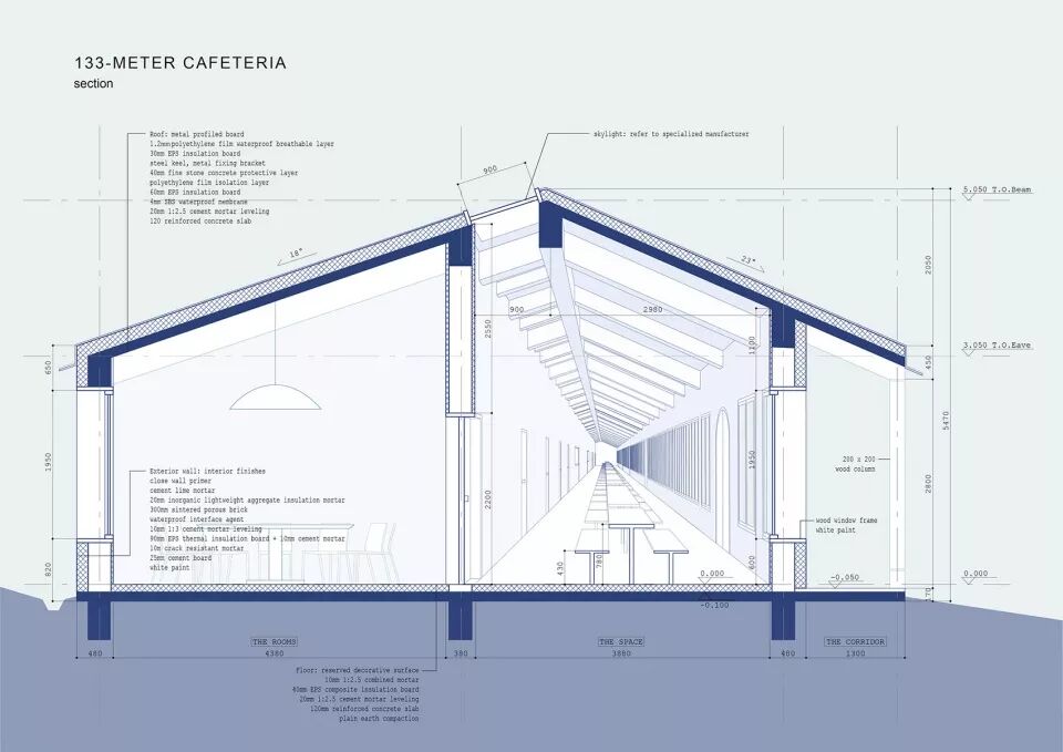 食堂总给人一种过客的印象。「百米食堂」试图改变人们的认知:食堂也可以像家一样,从容、自然、亲密和愉悦。我们借助简朴的建筑语言,要在食堂里融合「街」和「家」带来的美好体验。犹如村民食堂,「百米食堂」也不是一个封闭的学生食堂,既接待来自四面八方的小运动员们,也同样开放给营盘村村民和游客。「百米食堂」属于营盘村每一个村民和到访者。