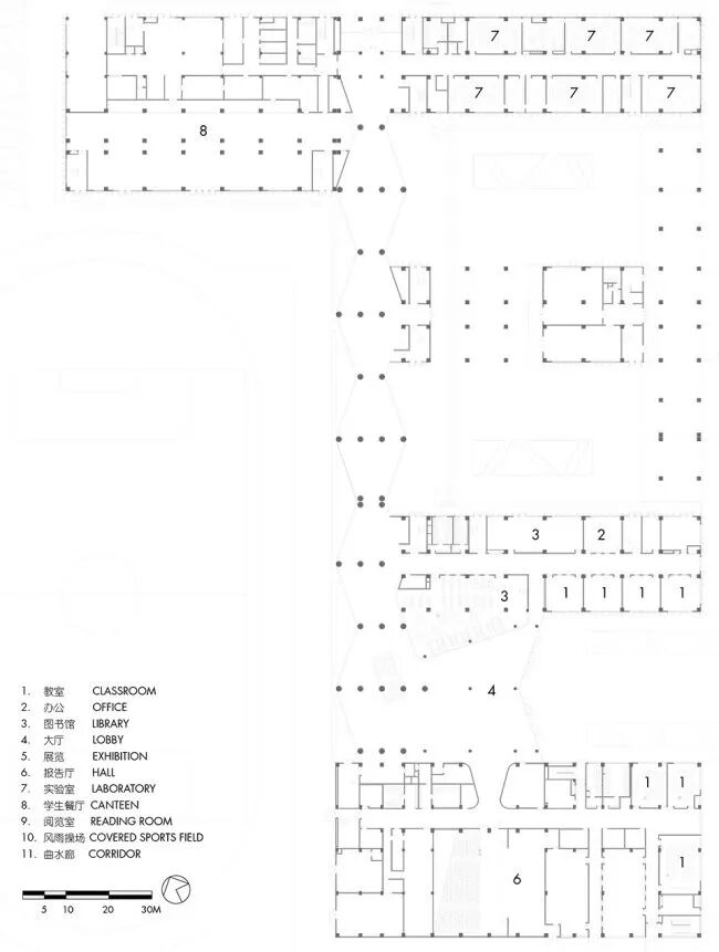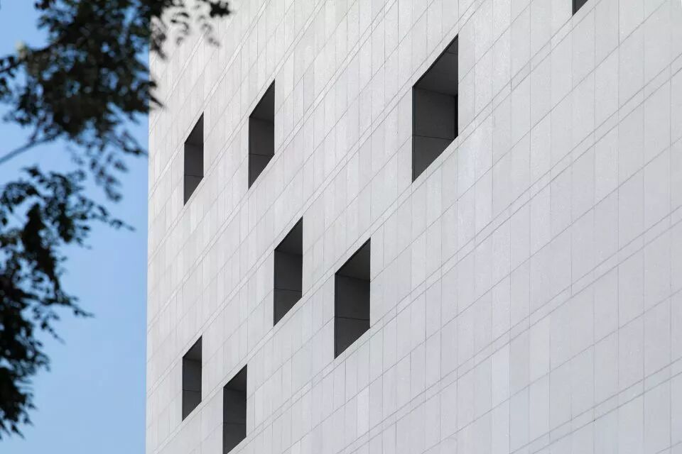 ▼在更需要采光的教学楼部分采用了均匀划分的竖向石材装饰线条