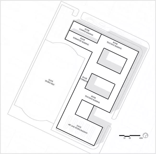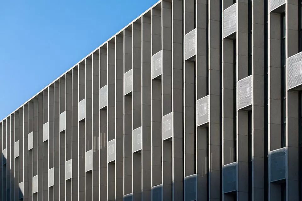 我们在更需要采光的教学楼部分,采用了均匀划分的竖向石材装饰线条,增加建筑采光;在对于光环境有苛刻要求的艺体楼部分,采用了横向石材装饰线条,强化其遮阳效果,并在局部采用了大面积的石材幕墙。横纵装饰线条从功能出发,形成了鲜明而有韵律感的立面形式,并凸显不同建筑功能,成为新时代校园建筑的典范。