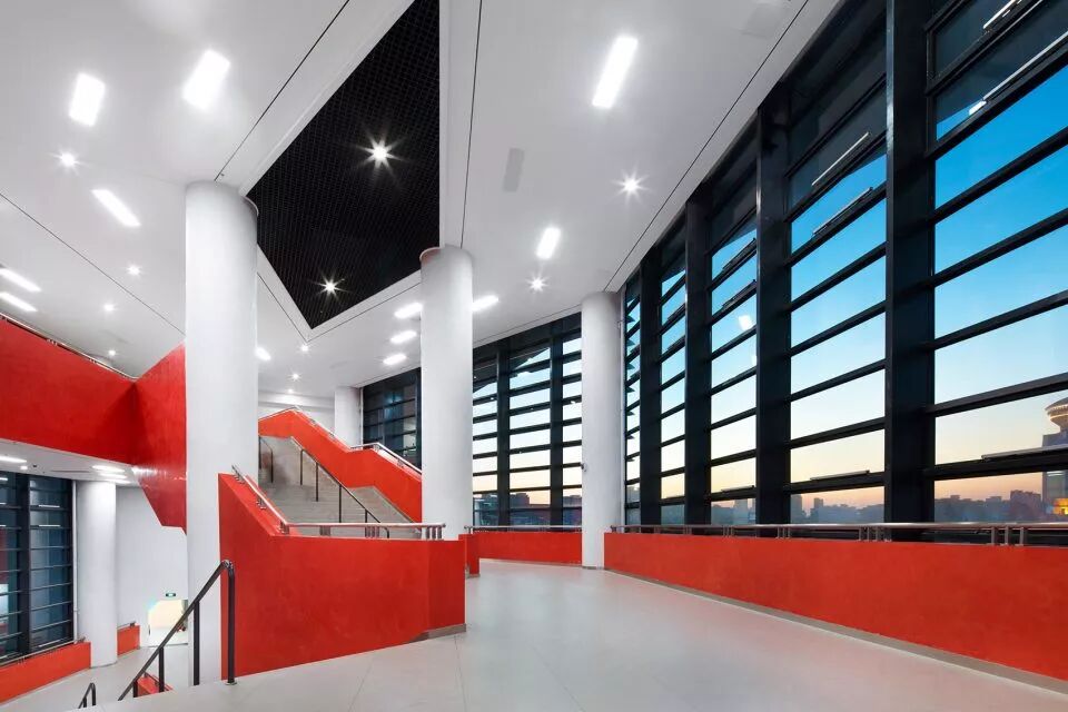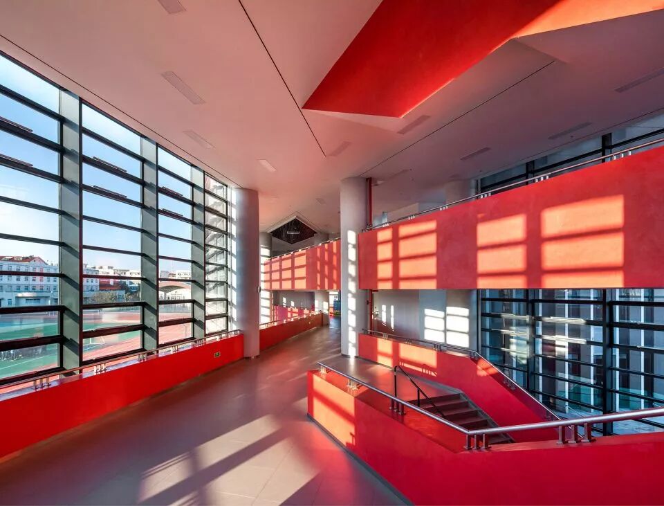 我们颠覆了传统校园3m宽的普通走廊模式,通过对互动空间的思考,将交通空间层层错动,以活泼的形态,打破了沉闷乏味的传统楼梯与剪力墙结构,将五层的连廊像“麻花辫”一样编织起来,醒目的红色线条,活跃了空间氛围,并具备强烈的空间导向性,在这条纵穿校园的连廊中,创造了开敞而灵活的公共交流空间。在这里,孩子们可以恣意奔跑、嬉戏,在课余生活中获得不同于中国学生枯燥的“三点一线”生活的多样的游走体验。