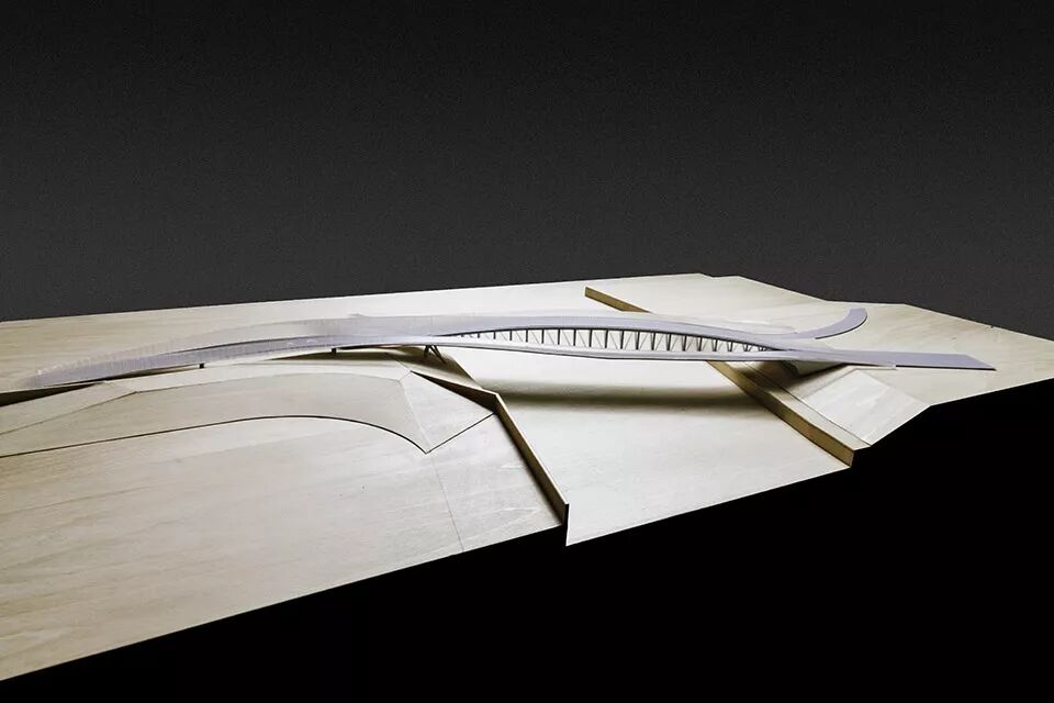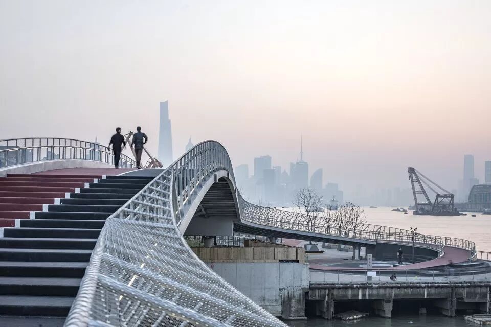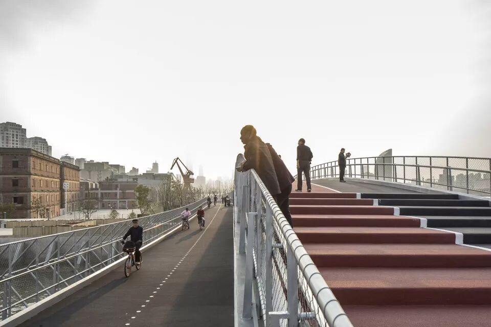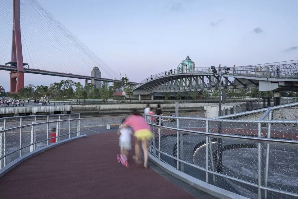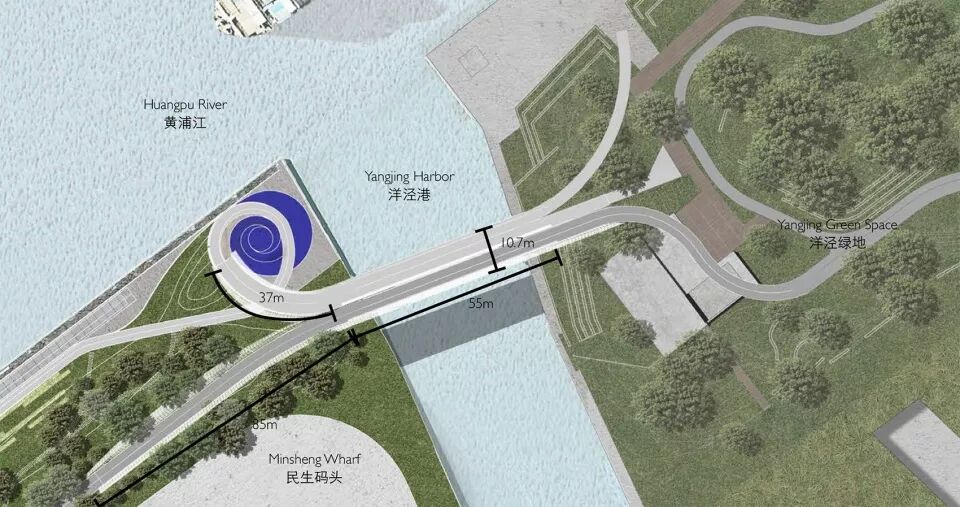 为预留未来河道的通航高度,桥底需达到绝对标高9.5米,进一步加大了桥面同两侧码头面的高差。西侧的骑行道引桥平缓地接入民生码头的绿坡树林,自然而又不经意地就跨越了防汛墙。漫步道采用螺旋曲线的形式,在局促的码头空间内获得足够的引桥长度,引导人流进入空间层次更为丰富的民生艺术码头。主桥东侧过桥台后直接接入洋泾绿地的步道,标志性的栏杆语汇延伸入场地内部。