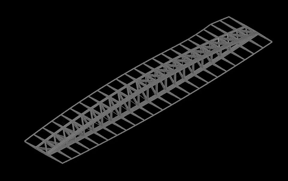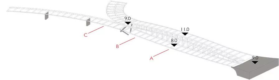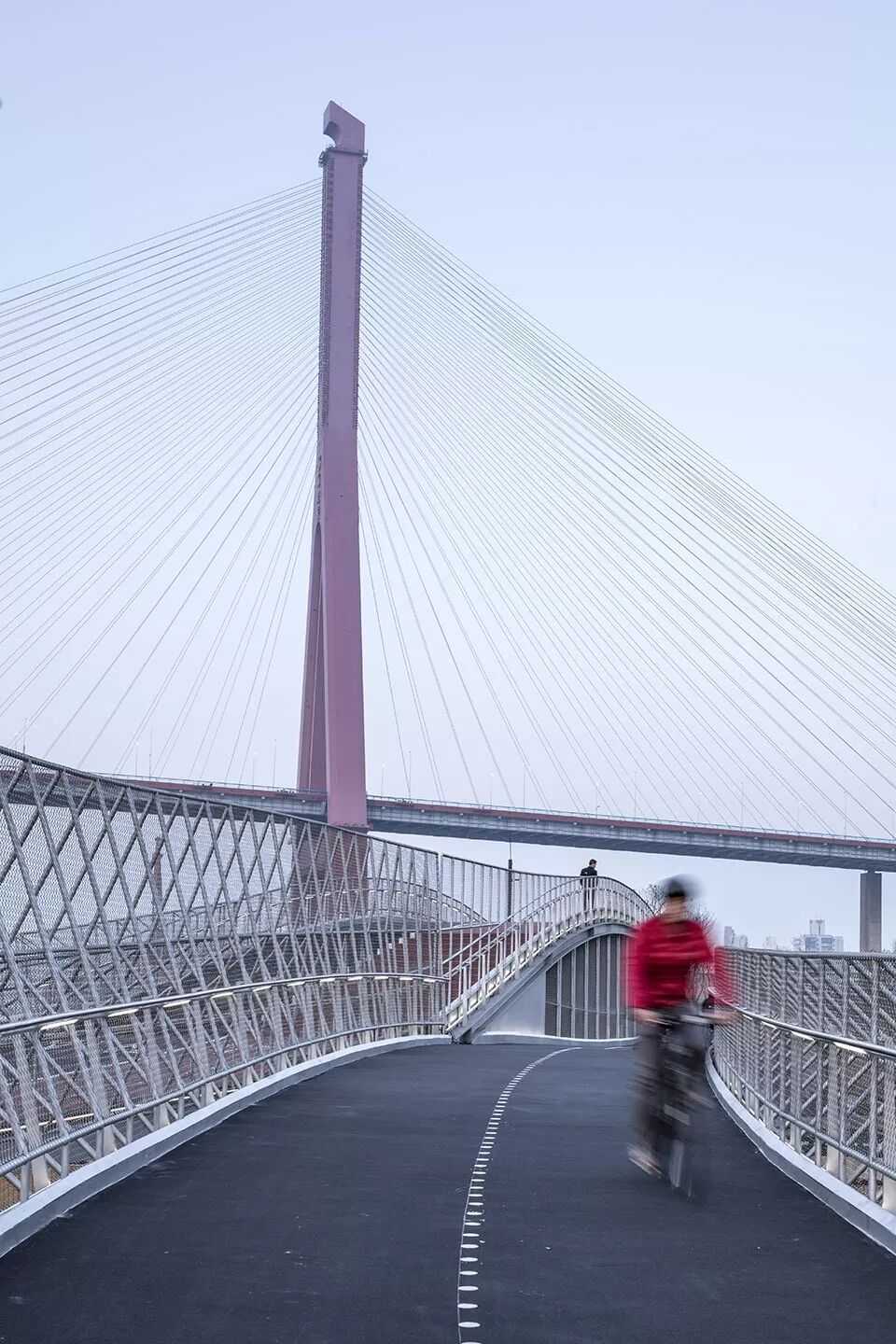 ▼骑行道布置在平缓的桁架下弦,慢行道布置在上弦 ©田方方
