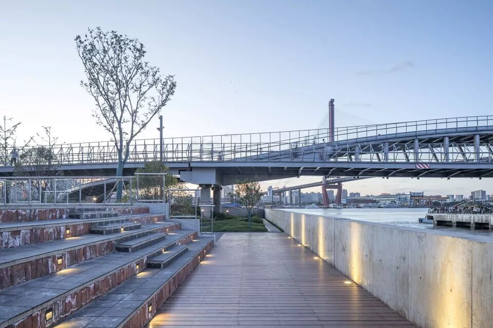 民生码头侧的桥下空间,结合洋泾港防汛墙改造,设置了一处观景平台。 利用防汛墙作为围栏,采用下沉树池结合台阶的手法与周边景观结合。