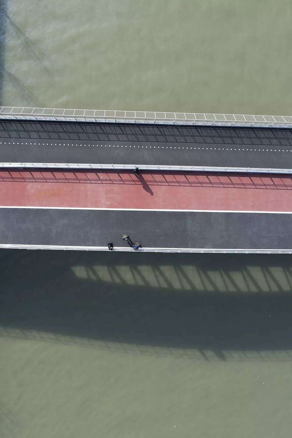桁架结构跨度55米,高度4米,本项目利用高差隔开骑行及漫步道区域,保证安全通行互不干扰,各自拥有良好的观景视野。为适应不同通行方式的坡度需求,设计将梭形上下弦的弧度进行了调整。骑行道布置在平缓的桁架下弦,坡度均控制在4%以内,提供舒适安全的骑行体验,沿江侧靠竖杆形成防护界面。慢行道布置在上弦,跑步及步行能适应10%的坡度,局部坡度较大处设置缓步台阶,视野开阔,桥面放宽形成驻足休憩的空间。桥面铺装采用统一的环氧树脂材料,深灰色为骑行道,红色为跑步道。桥面放宽处,又再使用深灰色划分出漫步区域。