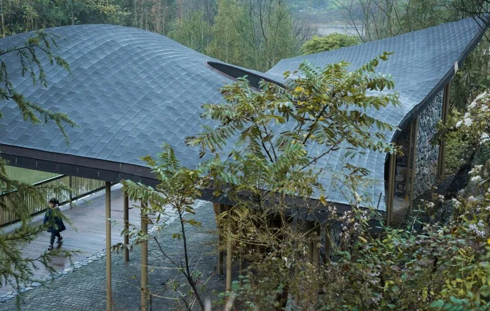 保护:设计对当地特色的地形地貌及植被进行了最大程度的保留,仅引入了一些具备观赏功能的景观设施。例如,村庄原有一个很深的小天坑,坑外一面是峭壁,一面是绵延的松林坡地。设计仅设置了穿越松林的临崖小径和深入坑底的蜿蜒坡道,保留了深坑和悬崖千万年的原始形貌。在另一处茂密松林中,也仅引入了一座材质天然、形态素朴的亭,让人可以停下来安静地感受自然的能量。