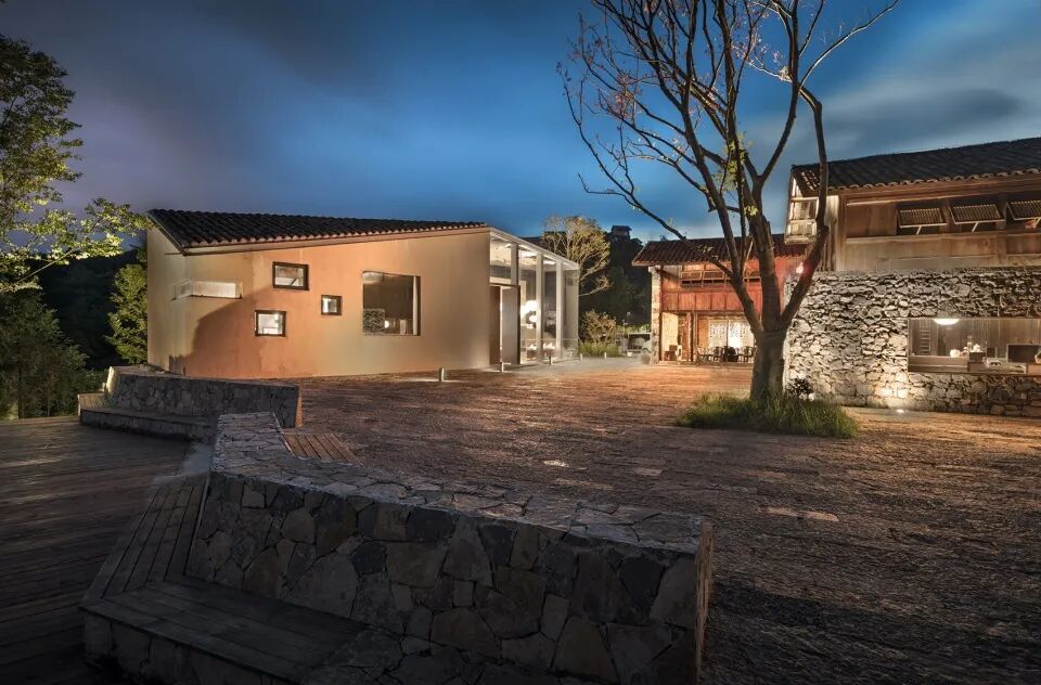 改造:为了赋予老旧建筑(尤其是村公所、祠堂等公共建筑)更完备的新功能,设计师对部分宅院进行了改造。其中,小镇接待处的前身就是一座百年老房。设计在保留原有建筑结构的基础上,修复了石墙、灰瓦、木窗等传统建筑材料,并在其旁新建了以夯土、玻璃、钢构为材料的现代空间,形成新老材料的对话。以此唤醒时空记忆,保留原有文化价值。此外,设计师还对村公所和老茶馆的原有建筑进行了加固修缮及内部功能的更新,以展现乡创社群的新生活方式。作为小镇标志节点之一的天空餐厅也是由一座天坑旁的老宅改造而成。设计用毛石还原院落,并在缓坡边架起一片木质平台,将人的行为延伸到了崖边。