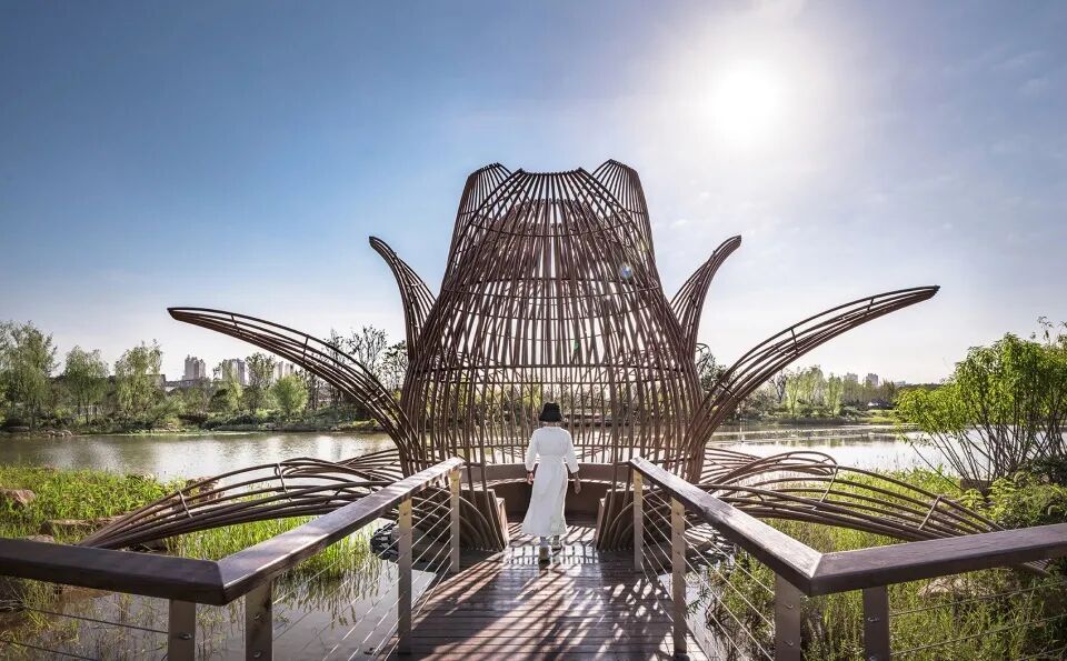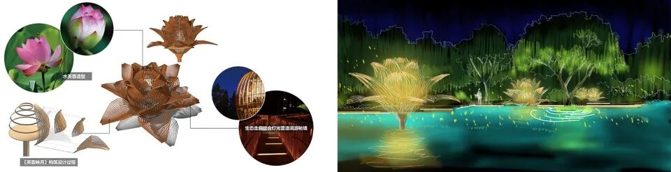 芙蓉构筑(休憩亭)造型,提取上饶理学文化的代表人物之一周敦颐《爱莲说》出水芙蓉的形态。夜间伴随变幻的灯光亮化,盛开在饶城湖畔。