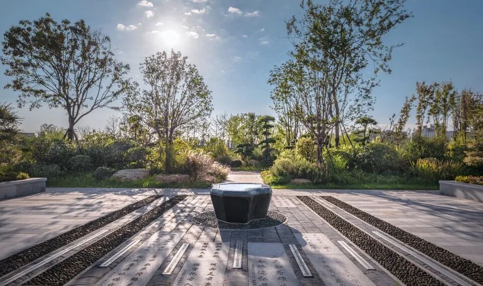 步入牌坊,途经松石对景,抵达环形广场。主景雕塑结合十里槠溪产业logo,提取灵山山形,以灵动曲线勾勒灵山的秀丽多姿。经多轮建模推敲,环中设计雾喷系统与灯光系统,赋予科技梦幻感。