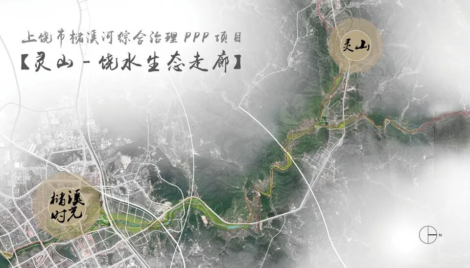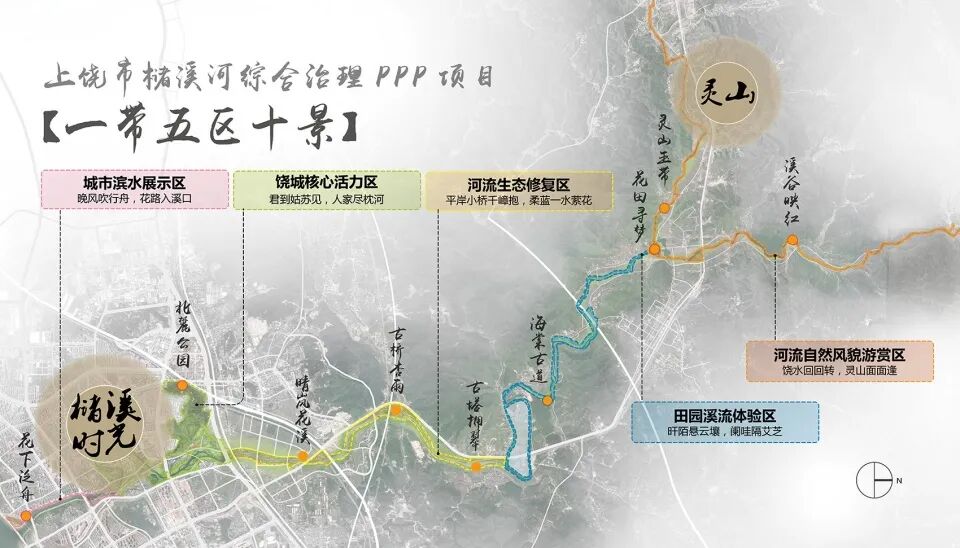 槠溪河是串山联城的生态纽带,是见证古饶城历史变迁、承载乡土记忆、孕育风土民情的时空通廊。河道沿岸秀美,但现有场地呈现景观无序化、基础设施不完备、两岸交通割裂等问题。依托上饶市“灵山信水”的山水格局和城市意象,在上饶市槠溪河综合治理PPP项目中,我们通过整合自然山水、生态环境、村落农林等沿河周边资源,以“一带五区十点”的景观结构,规划槠溪十大主要景点,衔接灵山景区及上饶城区,构建集自然观光、文化展示、休闲游憩、生态保护等功能于一体的灵山-槠溪-信江休闲生态走廊。