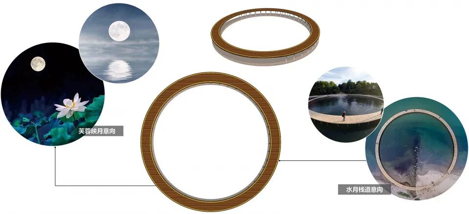 映月栈道,提取一弯明月的形态,前端挑出水面,采用钢结构及生态木结构组合而成。栈道内部暗藏LED灯,夜间倒影于湖面上,寓意水中映月。