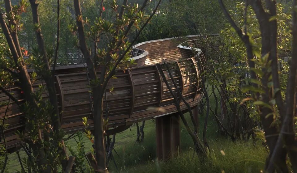 基地北侧延续山林基底,依据地势变化增设曲桥,蜿蜒穿梭于树林之间。行人于此处步入公园,怀揣着怎样的心情,树梢轻颤,飞鸟停落,闹市的喧嚣在此归于幽静,曲桥又欲将行人引至何方呢?
