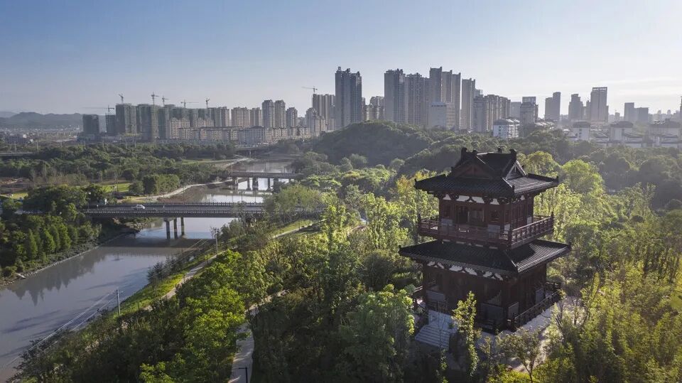 林茂草密,郁郁葱葱,结合现状山体,在制高点设置观景楼阁,既自成公园标志性一景,亦可登高俯瞰公园全景,感受溪畔大美饶城。