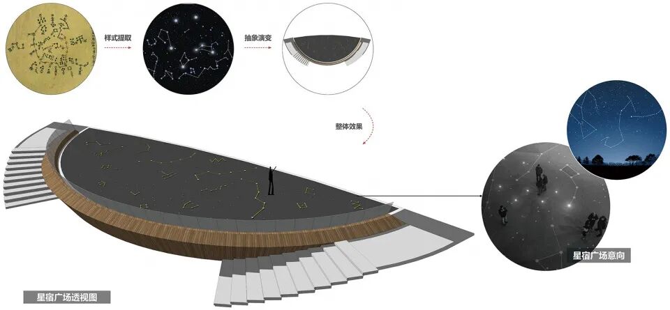 灵山被道家书列为“天下第三十三福地”,依托当地道教文化,在槠溪时光公园中轴延长线上设置观湖平台,结合道教二十八星宿,广场铺装上内嵌带状和点状的LED灯,重现二十八星宿星空,星云流转,构建神秘奇幻的夜晚景观。行人停驻于此,欣赏结庐花园之美,感叹时光流转之妙。