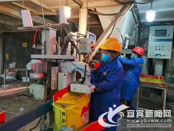 在兴文双胞胎饲料有限公司的生产车间,几名工人在生产线上熟练地进行着挂袋、放料、缝包等操作,机械手将包装好的饲料有序地从生产线上抓取到设定位置,叉车来回穿梭,整个流程有条不紊。