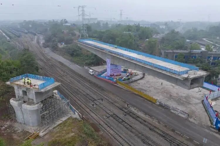 寒坡岭特大桥位于泸州市龙马潭区,全长3266.8米,全桥共有97个墩台,此次是以78号桥墩为轴,带动94米长预应力混凝土双线连续梁整体转体,梁体旋转57.5度后,实现与主桥精准对接。