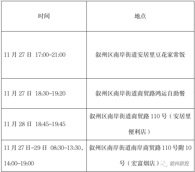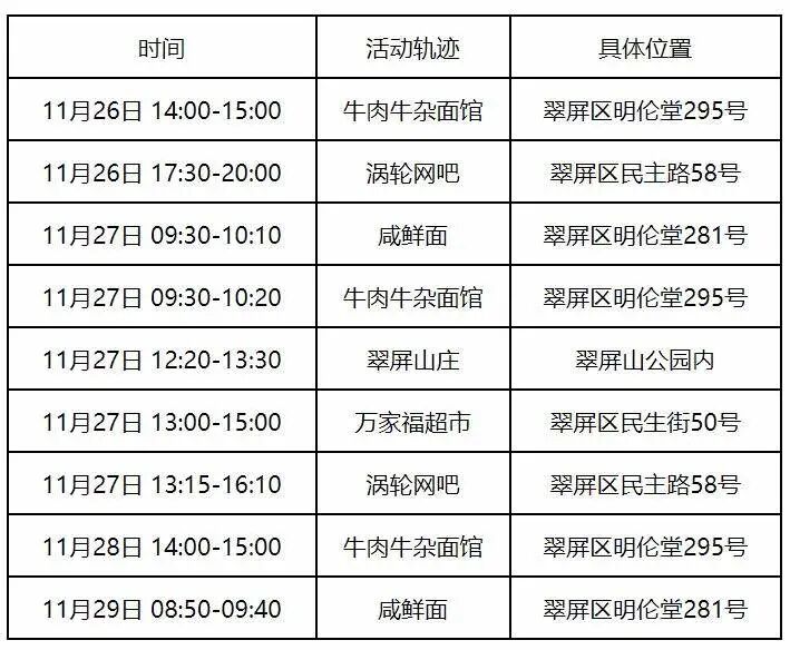 因疫情防控排查需要,现将新冠核酸异常人员在翠屏区轨迹如下,请与以下时间和空间有重叠人员,立即向所在街道(镇)、社区(村)、单位(或居住的酒店)等主动报备,做好个人防护,期间不聚会、不聚餐,不乘坐公共交通工具,配合做好核酸检测等疫情防控措施。