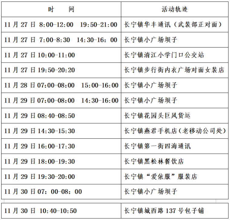 因疫情防控排查需要,现将新冠核酸异常人员在长宁县的轨迹公告如下,请与以下时间和空间有重叠人员,立即向所在镇、社区(村)、单位(或居住的酒店)、县疾控中心等主动报备,做好个人防护,期间不聚会、不聚餐,不乘坐公共交通工具,配合做好核酸检测等疫情防控措施。