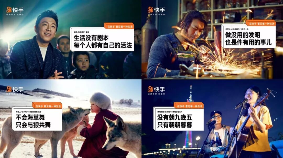 那天录制结束,看到北京公交站牌的广告“在快手,看见每一种生活”,有黄渤、谢娜明星代言,还有专心做发明的手工耿、养狼姑娘文静、自由弹唱的小蓉大兵……