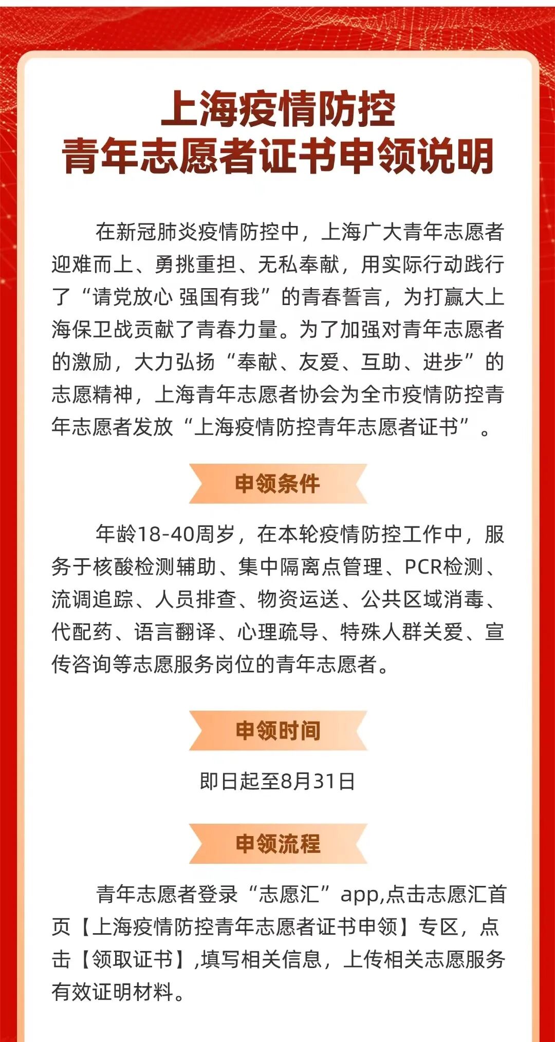 为加强对青年志愿者的激励,弘扬志愿者服务精神,“上海疫情防控青年志愿者证书”可以申领啦!