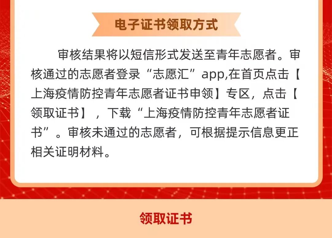 审核通过后,志愿者可登录志愿汇,进入首页“上海疫情防控青年志愿者证书申领”专区,点击“领取证书”,下载保存电子证书至个人相册。