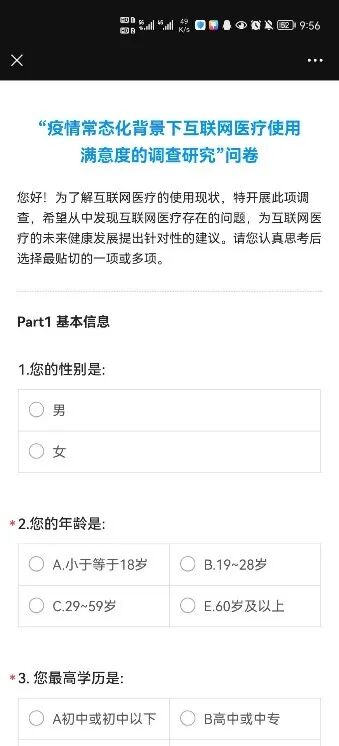 按照项目计划,7月为项目准备阶段,团队成员通过查找阅读国内外相关文献,了解“互联网医疗”目前的使用现状以及影响医疗服务满意度的因素等,确定本项目的具体研究方向以及问卷设计维度。小组主要以上海、成都、芜湖的各级医院为考察对象,对其互联网医疗程序及服务体验进行了研究,作为本次调查问卷设计的参考。并参考国内外相关文献,自行设计了《疫情常态化背景下互联网医疗使用满意度的调查研究问卷》。主要内容包括四个部分:一般人口学特征、互联网医疗服务使用情况、互联网医疗使用满意度、用户对互联网医疗的建议和意见等。对于“互联网医疗使用满意度”,分别设计了Likert问卷,共13道题。对于“不同种类互联网医疗服务的使用情况”,设计11道题目,同时Part2中Q3—Q8针对被访者的互联网医疗使用习惯进行调查。