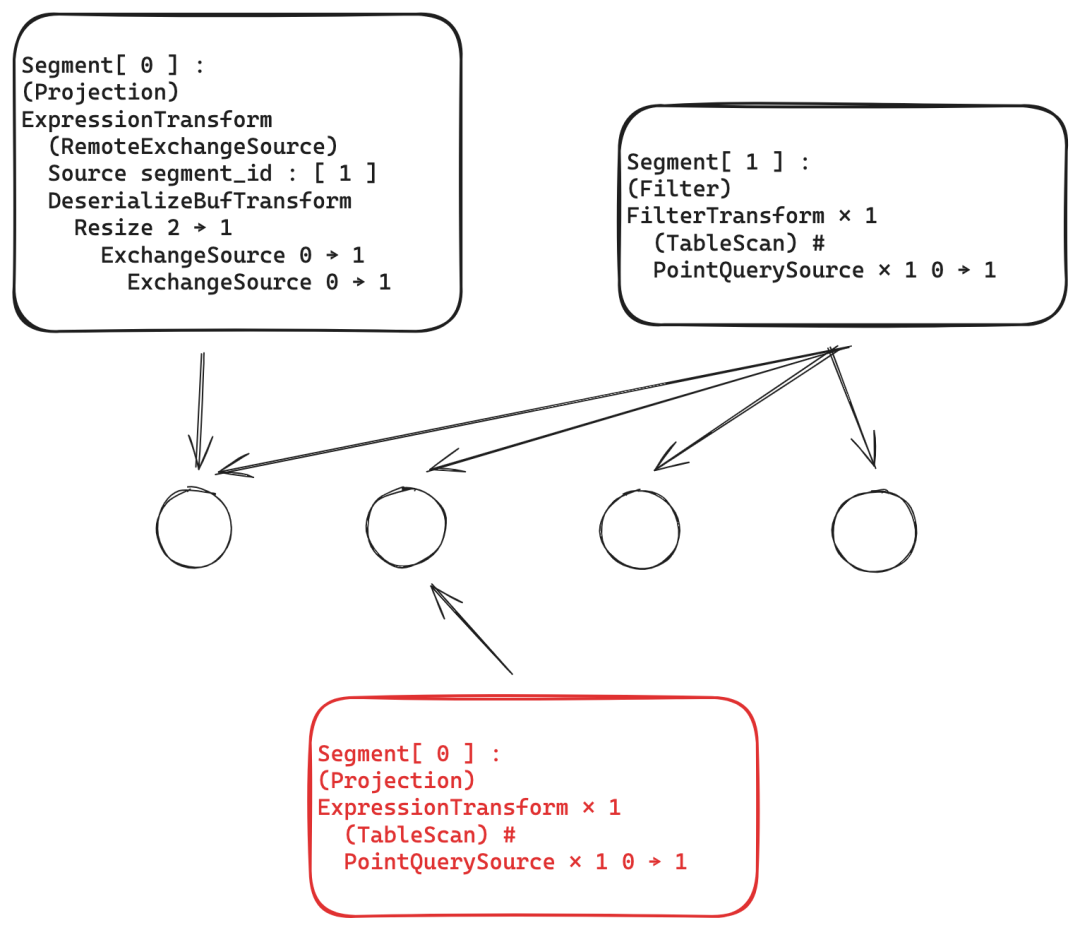 普通的query会生成执行计划,分为两个阶段:阶段一,segment 1下发到各个节点去执行,阶段二 segment 0 汇聚各个节点的数据,这种计划会带来大量的 plan 序列化反序列化,网络传输、数据汇总等一系列的开销;而在点查场景中,可能存在点查只会命中一条数据,那么这一条数据势必就会存在于某一个节点上,那么没有必要把计划发送到各个节点。为此,我们做了如下优化: