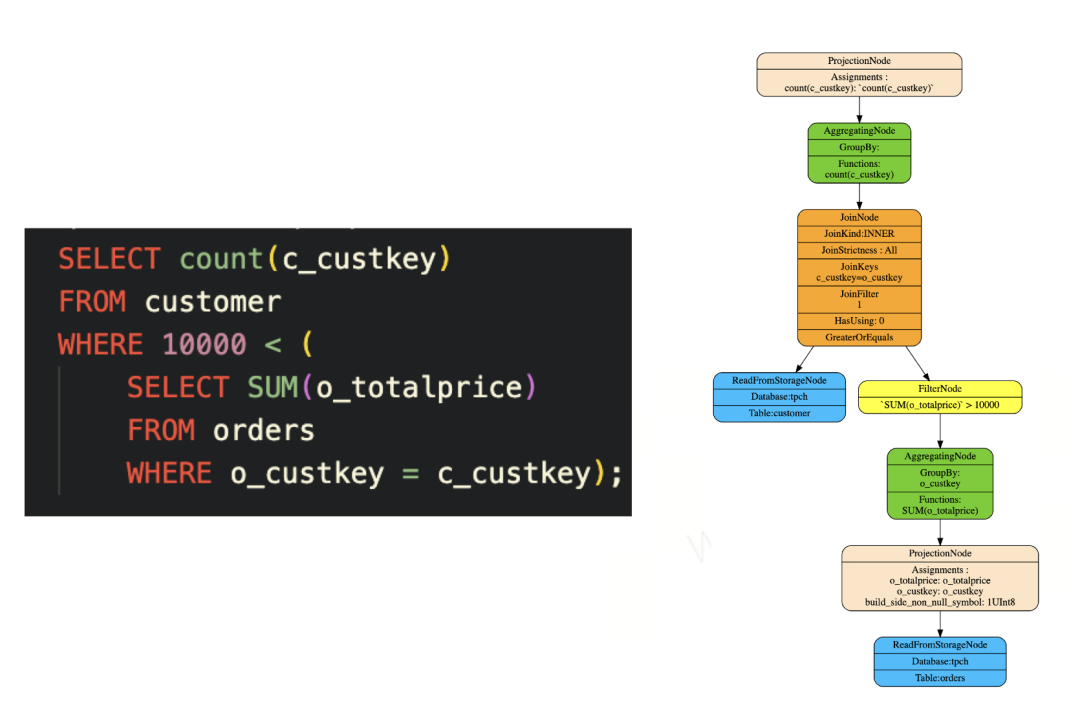 相对社区版ClickHouse,ByteHouse实现了完整的解关联,从而确保tpcds所有查询能够运行。如下图所示,一个customer表和一个含orders表的子查询进行关联,最后的计划会展开成对应的join、agg和filter等算子。